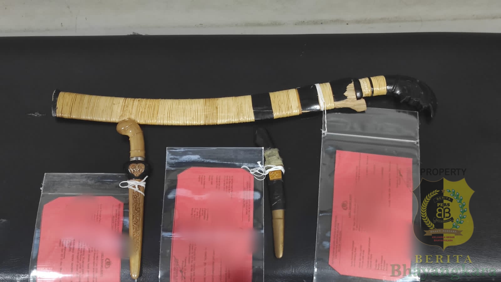 Dalam perkara ini, penyidik telah mengamankan sejumlah barang bukti berupa 1 buah pisau kecil dengan gagang berwarna hitam dan emas ditemukan di selokan yang digunakan RS, 1 buah kompang pisau kecil , 1 buah pisau kecil dengan gagang berwarna coklat ditemukan di dalam Mobil Pajero tanpa plat digunakan oleh IG, 1 buah Parang ditemukan di parit depan rumah TR yang digunakan oleh anak remaja (17), 1 lembar baju milik RS dan 1 unit Mobil Pajero warna hitam juga turut diamankan. Sementara benda yang oleh saksi disebut menyerupai senjata api masih dalam proses pencarian dan pendalaman lebih lanjut.