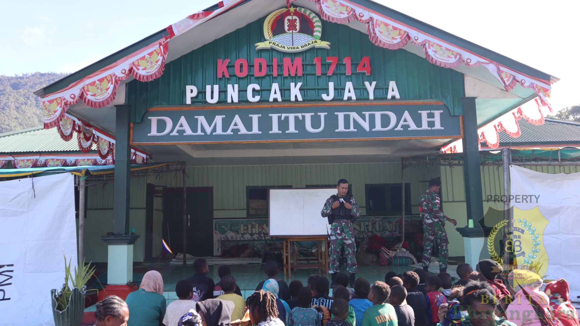 Bertempat di Makodim 1714/Puncak Jaya, Serka David Simanjuntak selaku Batiter Kodim 1714/Puncak Jaya bersama rekan-rekan Babinsanya memberikan materi metode Calistung (Membaca, Menulis dan Berhitung) kepada anak-anak pengungsi, dalam kegiatan ini anak-anak sangat antusias dalam menerima materi yang diberikan.