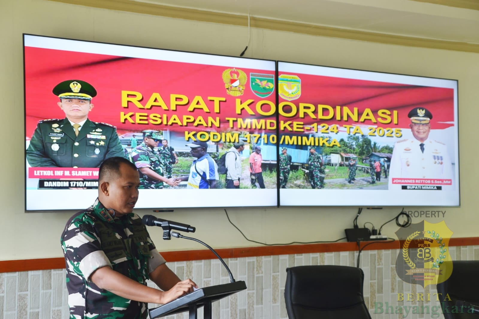 Timika, BeritaBhayangkara – Jelang pelaksanaan kegiatan TNI Manunggal Membangun Desa (TMMD) Reguler ke-124 T.A. 2025, Kodim 1710/Mimika menggelar Rapat Koordinasi (Rakor) yang melibatkan pihak terkait mulai dari TNI/Polri, Pemda Mimika, Aparat Distrik, Aparat Kampung, Tokoh Agama, Tokoh Masyarakat serta Wartawan, bertempat di Ruang Rekreasi Makodim Jl. Agimuga Mile 32 Distrik Kuala Kencana Kab. Mimika, Kamis (17/04/2025).