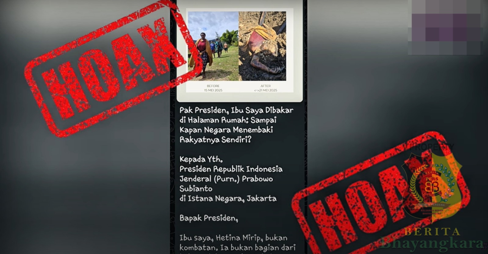 Jakarta, BeritaBhayangkara – Beredar sebuah surat terbuka yang mengatasnamakan Antonia Hilaria Wandagau, menyebut TNI membakar hidup-hidup seorang perempuan bernama Mama Hertina Mirip di Intan Jaya. Informasi tersebut dipastikan tidak benar dan menyesatkan. Klarifikasi dari pihak berwenang dan masyarakat lokal menyatakan bahwa Mama Hertina meninggal akibat kekerasan yang dilakukan kelompok separatis bersenjata OPM, bukan oleh aparat TNI.