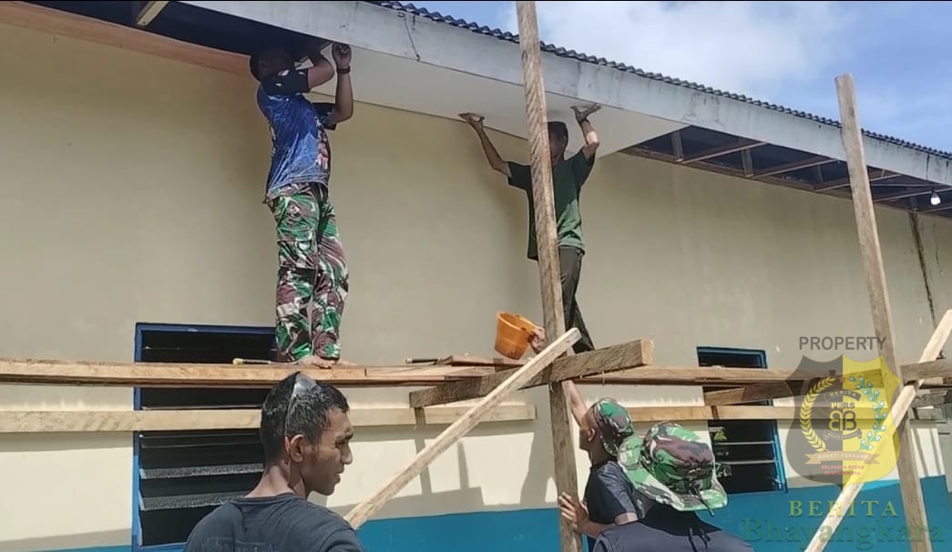 Personel Satgas TMMD bersama warga setempat melaksanakan proses pemasangan plafon di bagian luar gereja. Kegiatan ini merupakan bagian dari rangkaian pekerjaan renovasi yang telah dimulai sejak pembukaan TMMD beberapa waktu lalu.