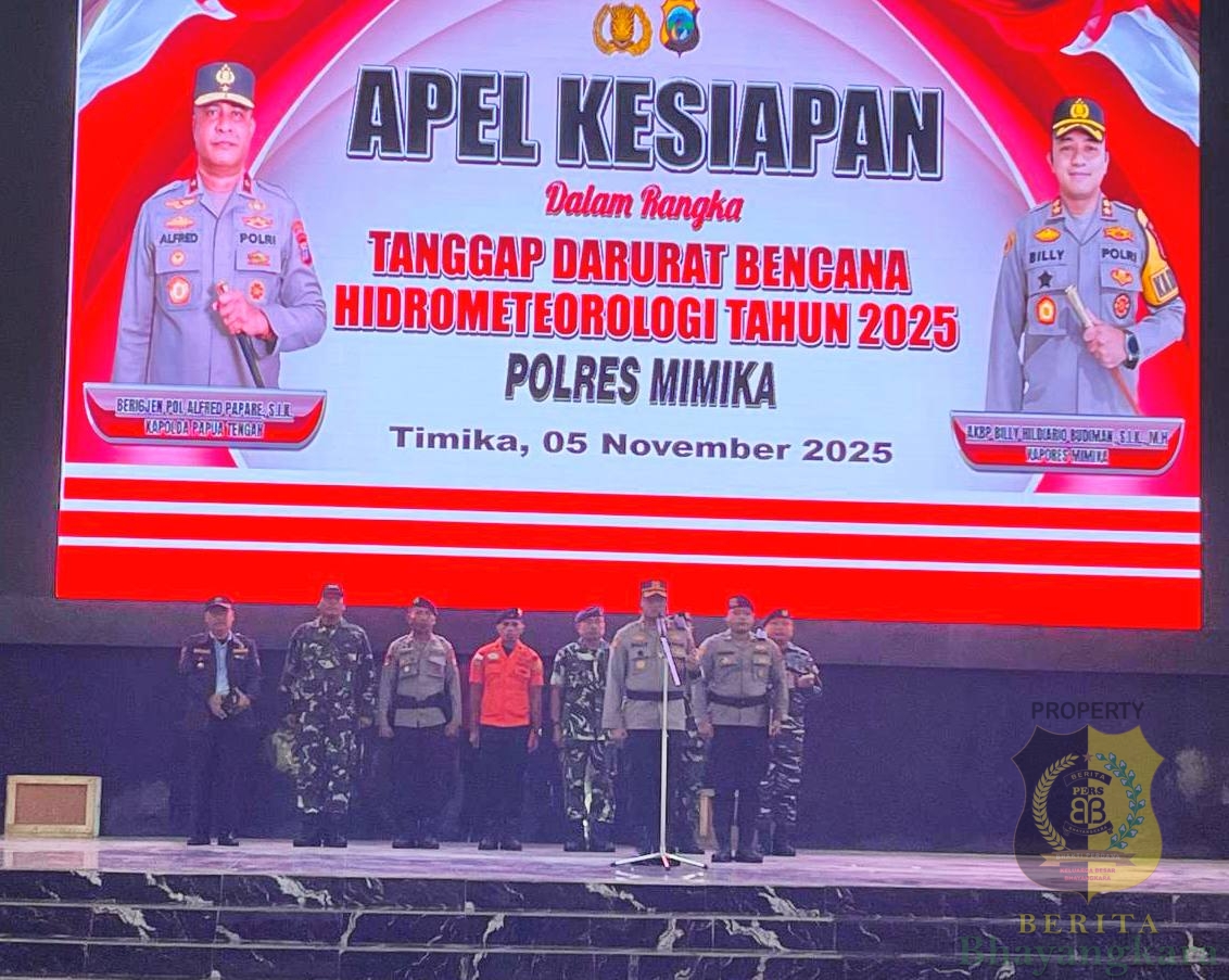 Timika, BeritaBhayangkara – Bertempat di Gedung Emeneme Yauware, Jl. Budi Utomo, Kel. Timika Indah, Distrik Mimika Baru, personel Kodim 1710/Mimika dipimpin Danramil 1710-03/Kuala Kencana Kapten Inf Agustinus Samba Palangiran mengikuti Apel Kesiapsiagaan dalam upaya menghadapi potensi bencana hidrometeorologi tahun 2025 yang dipimpin oleh Kapolres Mimika AKBP Billyandha Hildiario Budiman, Rabu (05/11/2025).